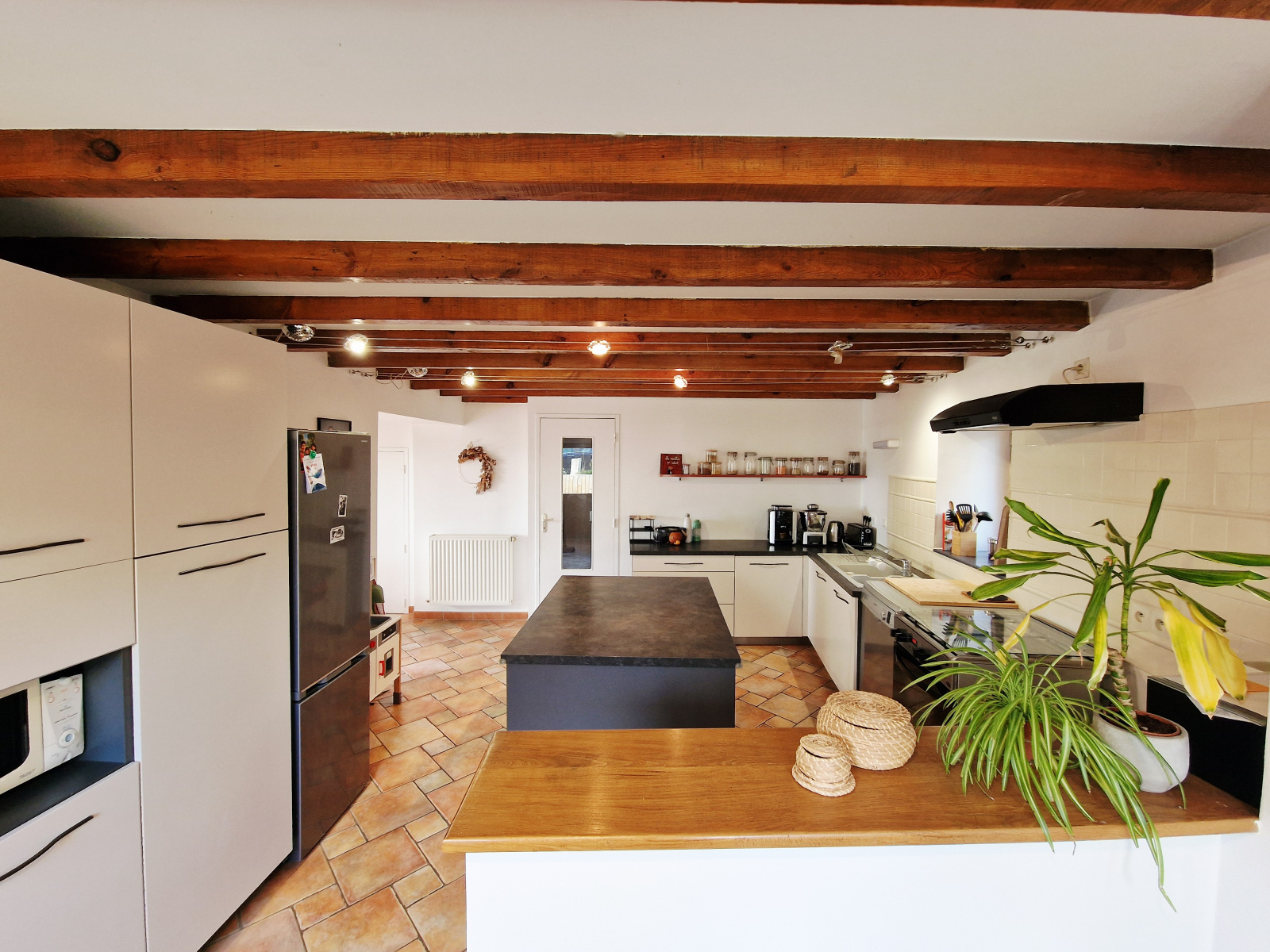 - cuisine (22m²) équipée d'un îlot central ouverte partiellement sur le salon,