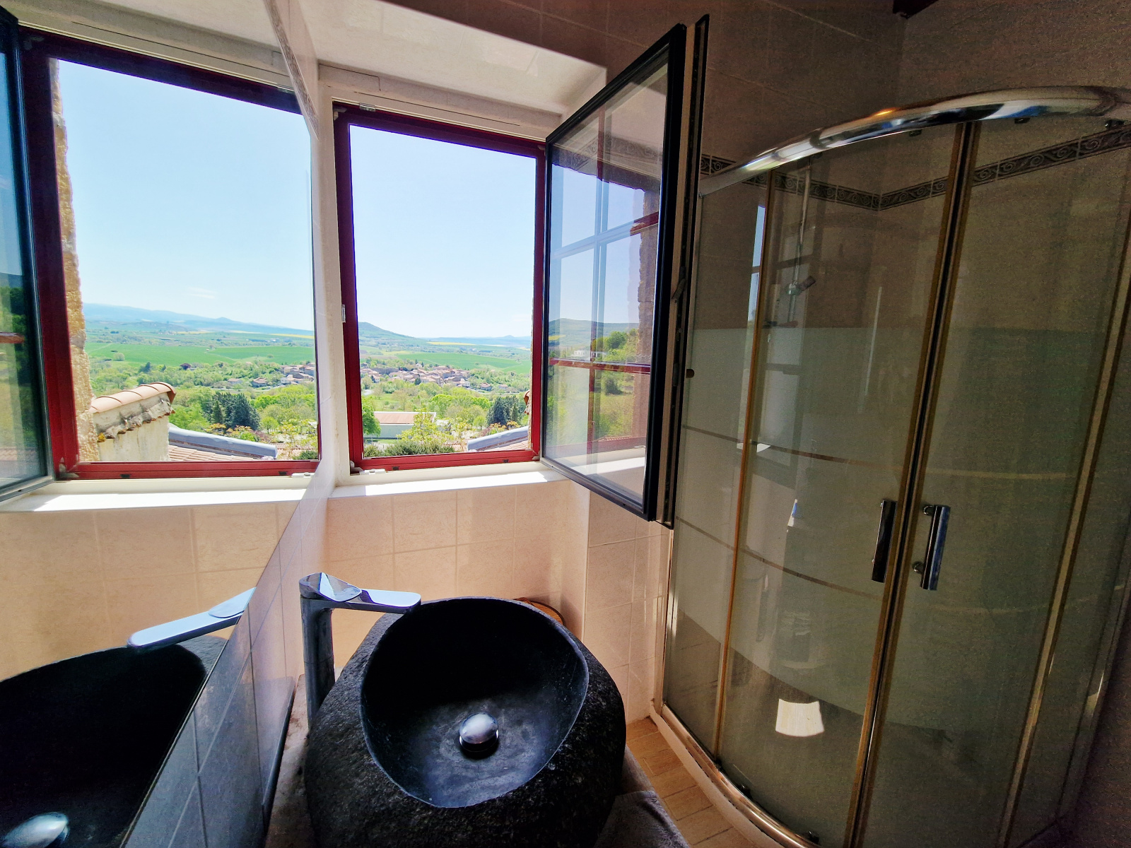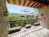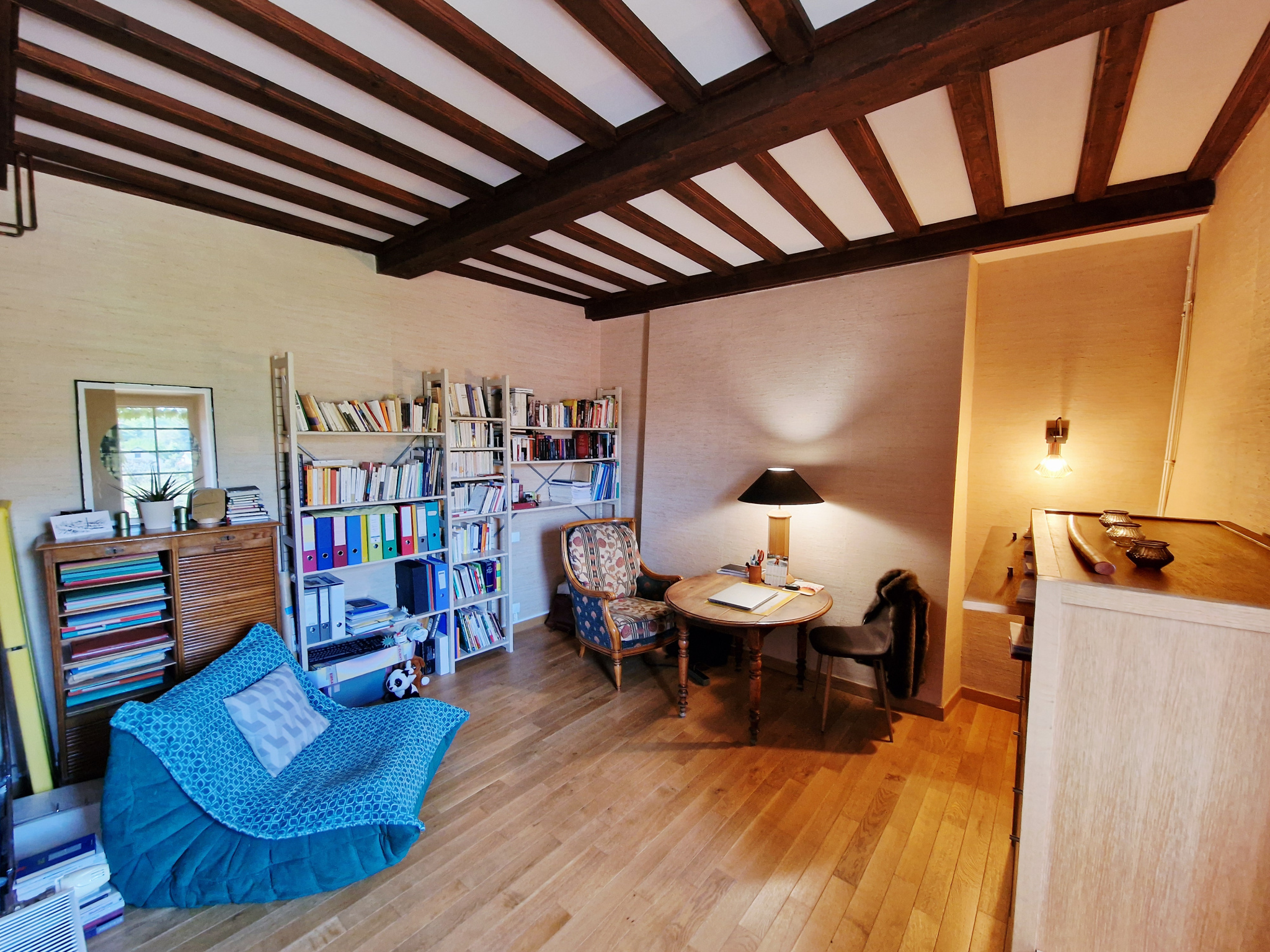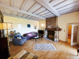 Le salon et sa cheminée ouvre sur une jolie terrasse avec une magnifique vue dégagée exposée au Sud, une alcôve accueille un bureau.