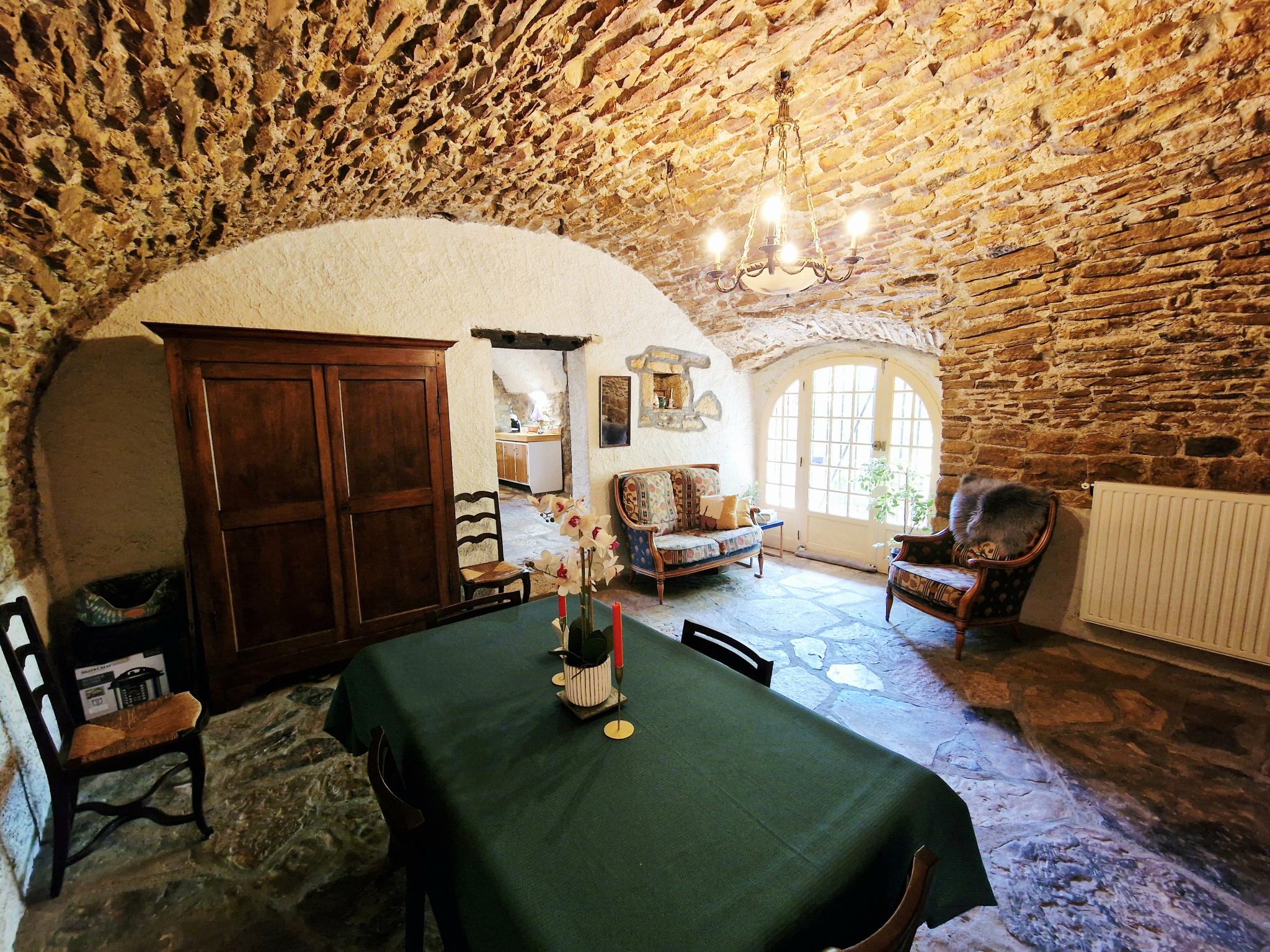 Dès l’entrée, vous serez conquis par ses magnifiques pièces voûtées, à usage de cuisine et de salle à manger.